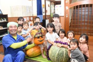 【広報取材】青壮年部員がカボチャ贈呈 園児の笑顔広がる