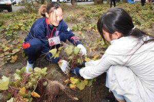 【広報取材】練習場で児童と選手がサツマイモ収穫