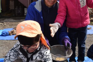 【広報取材】大豆農家が地元園児に大豆の脱穀指導