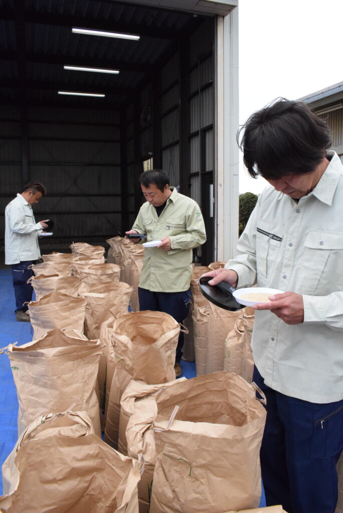 今年は県の奨励品種「はるみ」を主力に「てんこもり」「キヌヒカリ」「喜寿糯(きじゅもち)」の4品種計1,118袋、33.5トンを32軒の農家から集荷する予定です。