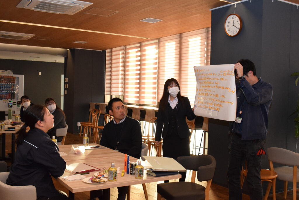 その後、テーブルごとに3、4人のグループに分かれ「デジタル技術の活用」をテーマに話し合いました。参加者は自身のデジタルに対する意識や希望について意見を出し合い、模造紙に業務上の課題や解決策を取りまとめました。