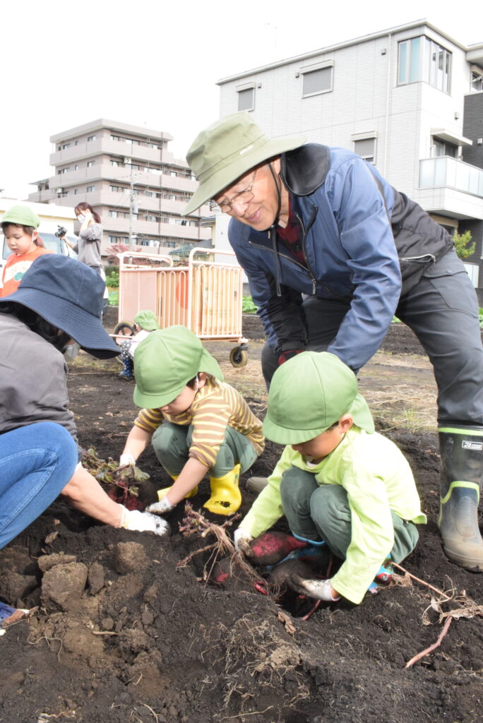 収穫体験では、柿島さんが収穫作業を奮闘する園児に「イモの周りの土を掘って」などとアドバイス。大きなサツマイモが姿を現すと、「大きいのが取れて良かったね」と、声を掛けていました。