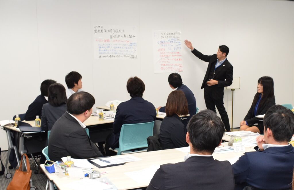 発表では、班ごとに設定したテーマと出された意見などをまとめ、他の参加者に説明しました。当JAの齋藤義明常務は「両JAの渉外担当者の参考点を取り入れ、組合員・利用者に信頼される訪問活動を実現してほしい」と激励しました。