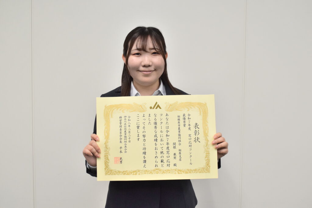 関根さんは2月20日に横浜市で開かれた「令和7年度JAバンク神奈川窓口応対コンクール」に当JA代表としても出場し、県下で最優秀賞を受賞しました。