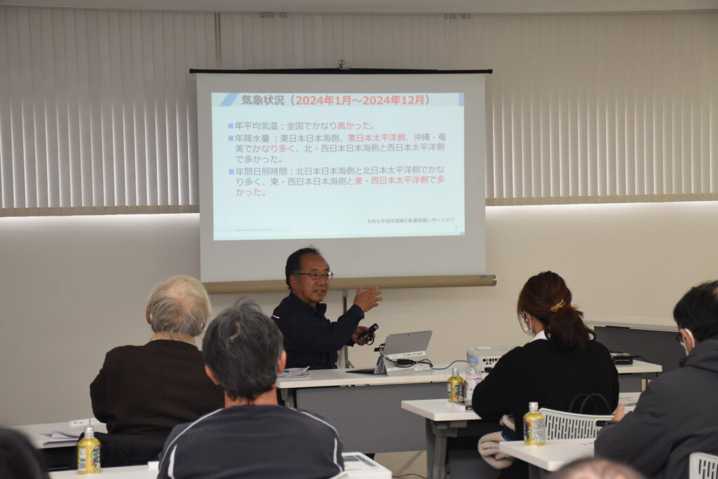 神奈川県農業技術センター北相地区事務所の職員が作成した資料を基に、JA営農センター職員が「高温期における栽培管理・暑熱対策および適応品種選定について」と題し講演。横浜市の気象データを参考に、熱帯夜や猛暑日、短時間強雨発生回数などが近年増加しており、農作物の管理が難しくなっていると説明。トマトやキャベツなどの野菜を例に、着色不良や虫害など高温障害による影響の実例を挙げ、その対策として、土づくりやかん水など栽培管理の見直しや高温障害に比較的強い品種選びを検討するように呼びかけました。