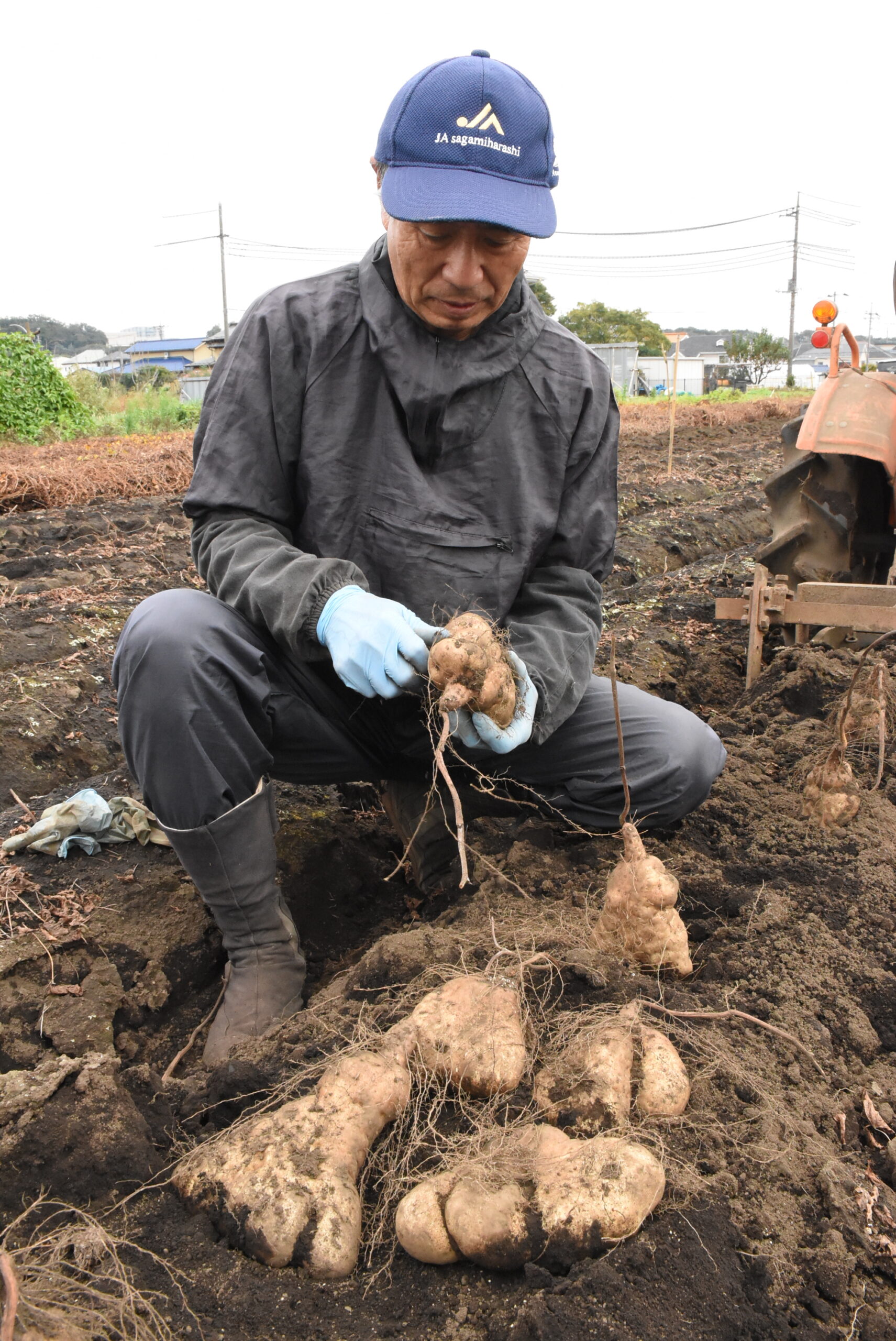 火山灰土の乾燥した相模原の土が、粘りの強い良質なやまといもを生産してくれます。棒状やイチョウの葉のような形を持ち、粘りが強く、でんぷんを分解するジアスターゼ(消化酵素のひとつ)を多く含みます。おいしくて栄養価が高いのが特徴です。