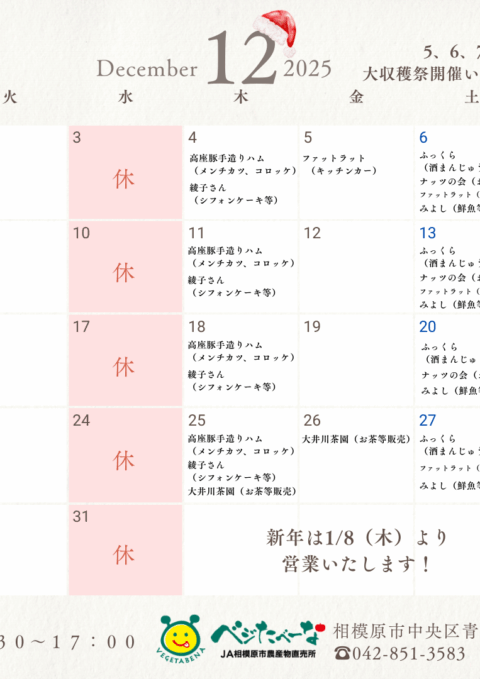 農産物直売所 ベジたべーな 12月のイベントカレンダーを更新しました